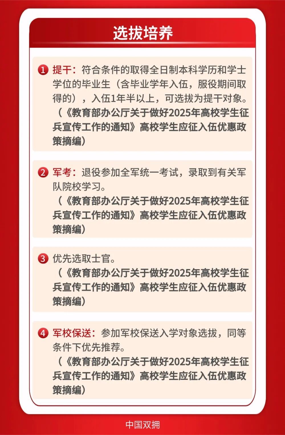 「就业指导」快收藏!大学生入伍优待政策一图看懂→想参军的大学生注意了!大学生入伍优待政策你知道吗?服现役期间保留入学资格或者学籍退役后两年内允许入学或者复学……让你既能圆军营梦也能顺利完成学业大学生入伍所关心的优待、学历、资助、就业和选拔培养等全国性政策一图看懂↓ ↓ ↓不止国家层面的法律法规各地也纷纷出台了相关政策以实际行动支持大学生入伍这些实实在在的优待政策既是国家对参军大学生的关怀与保障更是对青年学子投身国防的激励与召唤有军旅梦的你可千万别错过~...