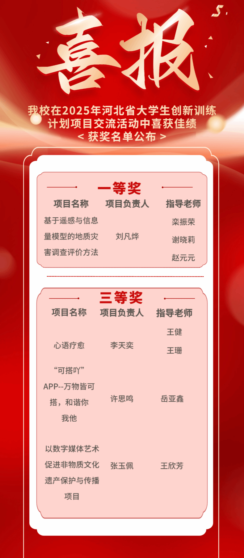近日,2025年河北省大学生创新训练计划项目交流活动圆满落幕。我校师生团队在本次活动中表现优异,共斩获省级一等奖1项、三等奖3项,充分展示了师生锐意进取、勇于突破的精神风貌,体现了我校在创新创业教育工作阶段性成效。