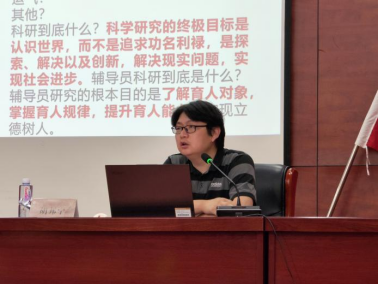 讲座伊始,胡邦宁教授直指核心,引导大家思考“辅导员的科研本质”。他强调,辅导员搞科研的目的在于了解学生、掌握规律、提升育人能力、落实立德树人,是工作实践的科学升华与专业化发展的必由之路。针对辅导员普遍面临的科研困境,胡教授创造性地提出需着力打通“心关、眼关、手关、人关”四关。